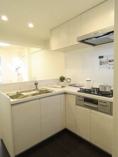 ホワイトカラーが美しいシステムキッチン。シンクの水栓は浄水器一体型です。