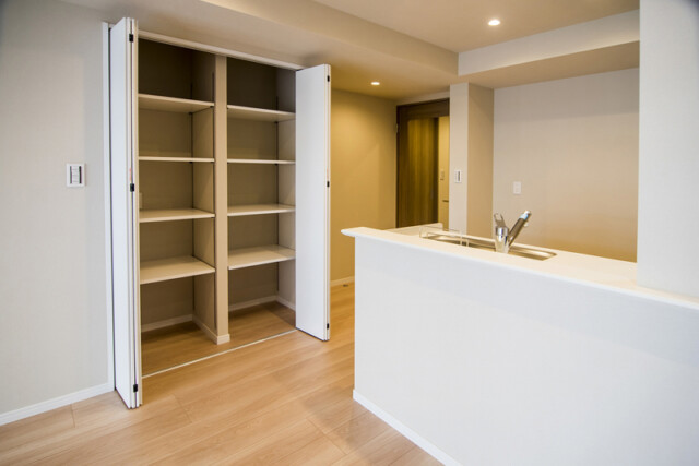 キッチンそばには収納棚。食料品のストックなどのキッチン周りの物を入れてもいいですし、リビングに散らかりがちな物を入れるのにも便利です。