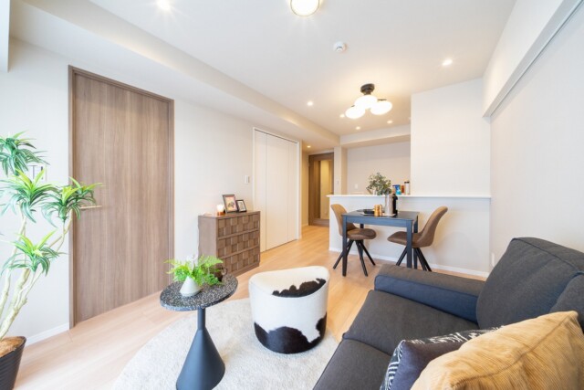 手前からバルコニーへ向かってカウンターキッチン、ダイニング、リビングと続く、オーソドックスなレイアウトのお部屋です。お好みでダイニングとリビングをひとつにまとめたりなんかもありですね。