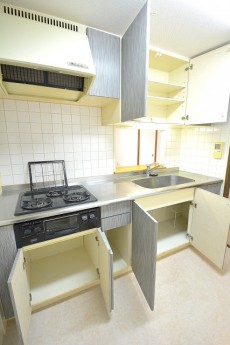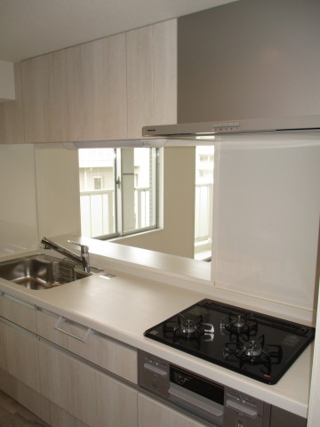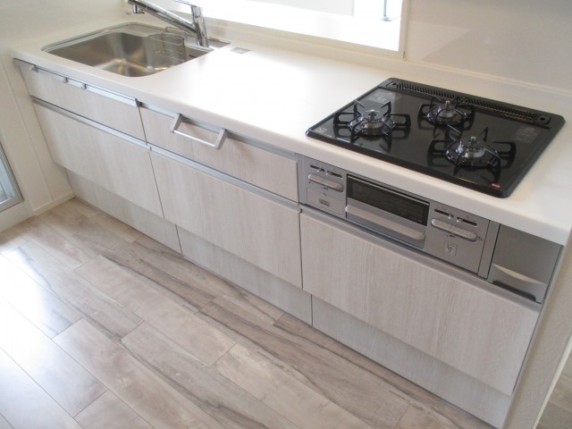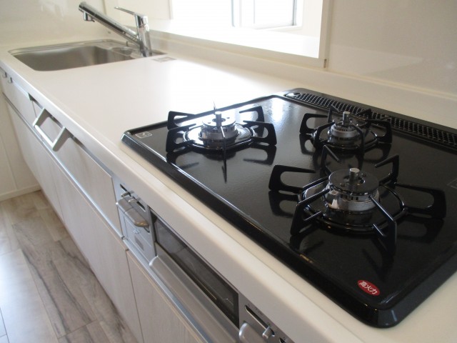 3口コンロのシステムキッチンは上下に収納場所もたっぷりあります。