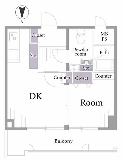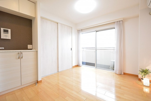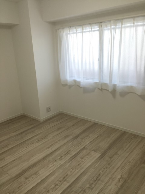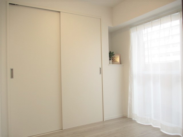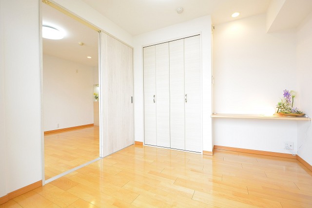 こちらはダイニングの隣の洋室。やはりバルコニーに面して窓があります。仕切りは引き戸なのでデッドスペースも無くお部屋全体を有効に使えますよ。クローゼットとカウンターが付いていて収納もOK!