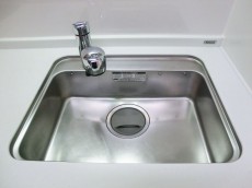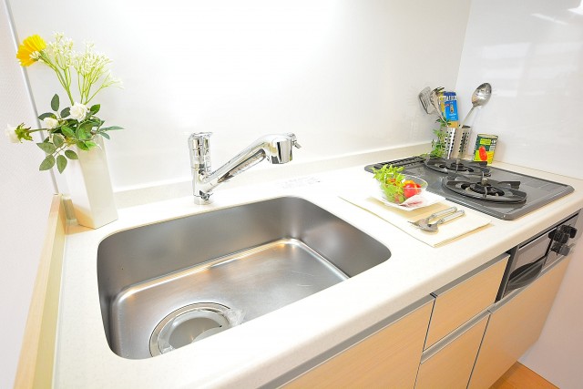 キッチン設備は2口ガスコンロ、グリルに浄水器一体型水栓も付いています。