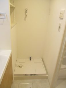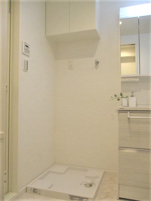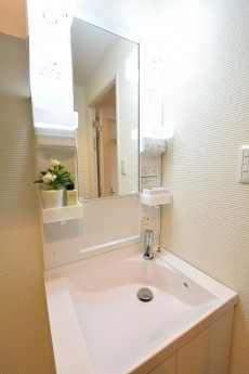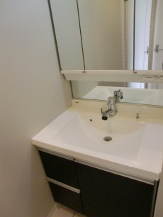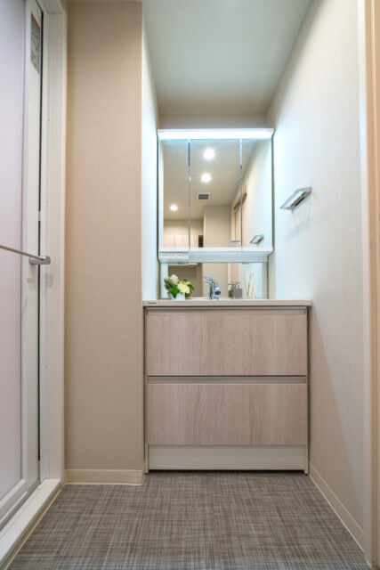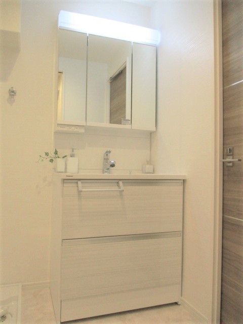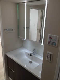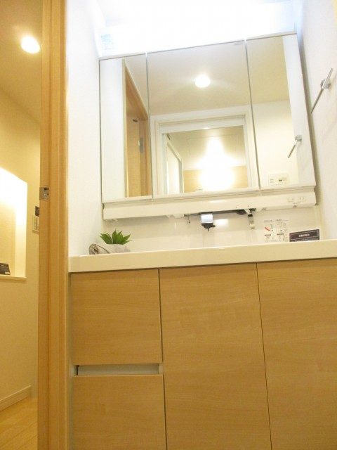 まずは洗面台。明るい色で清潔感がありますね。三面鏡にはライトも付いていますので、鏡を見る時に影になる事もありません。洗面台下の大きな引き出しと三面鏡裏のキャビネットで、いろいろな物を上手いこと収納出来そうです。
