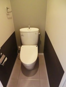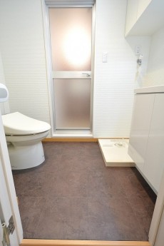 ウォシュレット付のトイレ。洗面室と同じ床タイルが使用されているうえ、