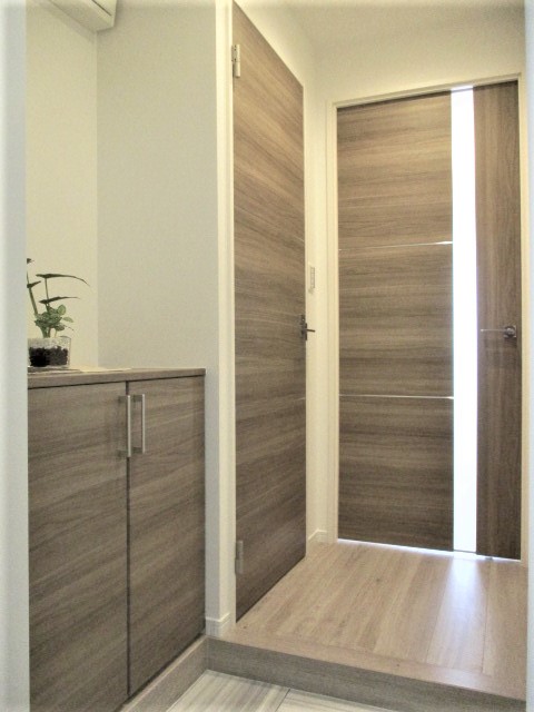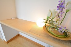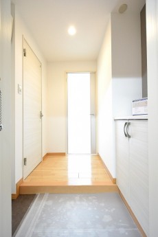 玄関にはロータイプのシューズボックスが設置されていて、上部はカウンターになっていました。何か飾るのも良し、鍵などを入れるトレイを置いて実用的に使うのもアリですね。廊下は短め。その分お部屋にスペースを使っています(^^)