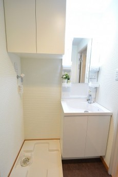 洗面室には洗面化粧台の他に、浴室と洗濯機スペースがまとまっていて、脱衣所も兼ねています。洗面化粧台は寝ぐせチェックに便利な三面鏡付き。前面パネルが建具とお揃いになっているところとか統一感があっていいですね。洗濯機スペースには吊戸棚も付いているので、洗剤などはそちらへどうぞ。