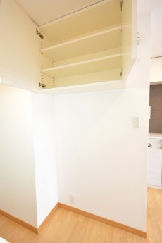 電子レンジなどをおくカウンターが置けそうなスペースがあり吊戸棚も設置されていて収納スペースが豊富にあります。