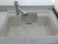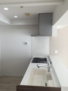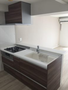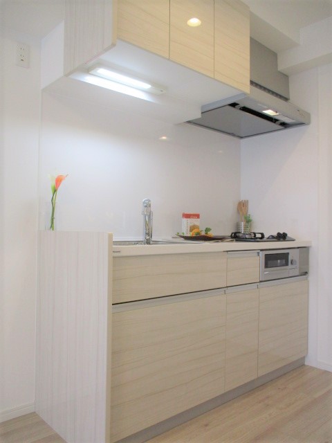 キッチンはパナソニック製の壁付けタイプ。圧迫感が無いように壁に近い明るい色になっています。調理台下だけでなく吊戸棚も付いていて収納力もタップリ。