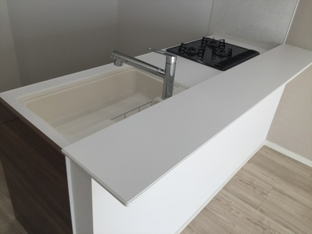 おります。3口コンロに浄水器一体型水栓が装備され、機能的でお料理しやすそう