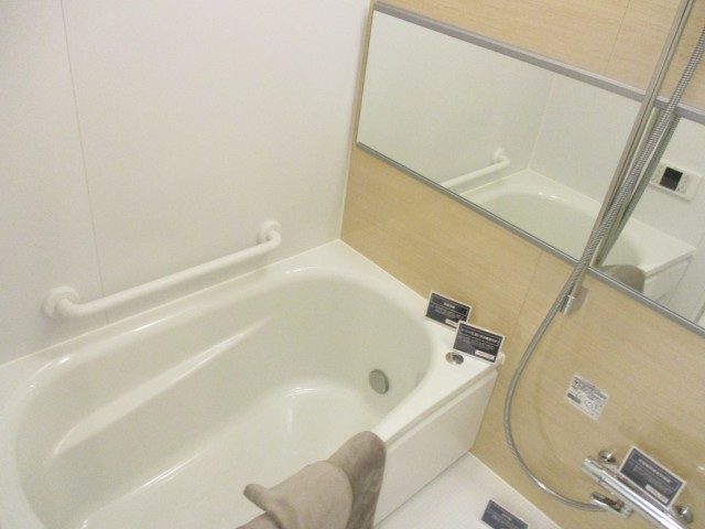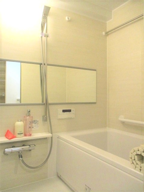 ゆったりと浸かれる大きな浴槽があります♪棚が大きく造られているので風呂桶等も置けちゃいます✿