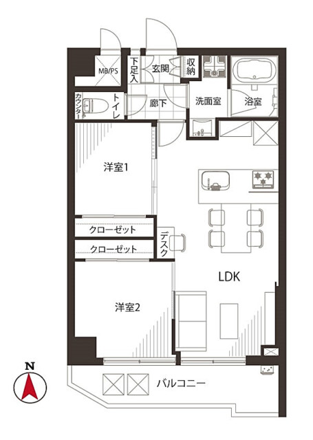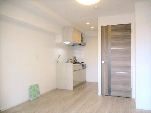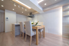 南向きバルコニーに面した明るいお部屋です。キッチン、ダイニング、リビングと並ぶ、オーソドックスで使いやすいレイアウト。サイズ的にも余裕がありそうですね。ふかされた天井や壁には間接照明が設置され、立体感のある広がりを感じさせてくれています。