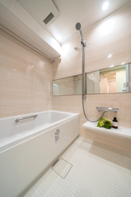 浴室は白を基調とした明るい雰囲気。追い焚き機能や浴室換気乾燥暖房機も付いて機能的にも充実しています。