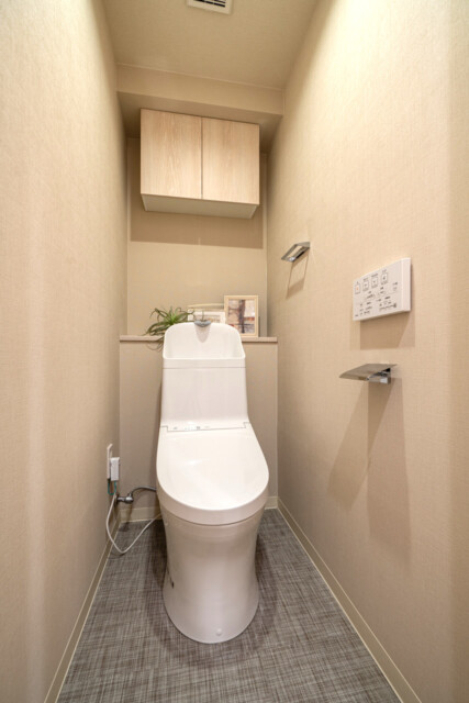 洗浄便座はTOTO製のウォシュレット。トイレットペーパーなどのストックに便利な吊戸棚も付いています。ちょっとした物が飾れるニッチカウンターも嬉しいですね。リラックスが大事な場所ですから、少しでも快適にしたいものです(^^)