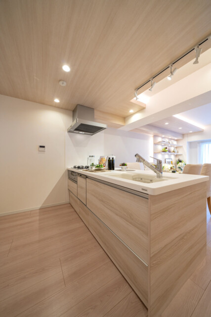 キッチンは人気のカウンタータイプ。見晴らしが良くお料理中でも会話がしやすいのが人気の理由です。食器洗浄乾燥機や浄水機能一体型水栓など便利機能も充実!!食後は洗い物を食洗機にお任せして、優雅にコーヒーを淹れたりとか出来ちゃうんですよね♬