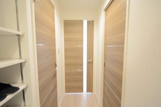 共用廊下は内廊下。玄関前で雨や風の影響をうける心配がなく、プライバシーも保ちやすいです。