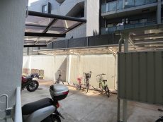 こちらのお部屋の玄関前は敷地内の駐車場及び駐輪場です。