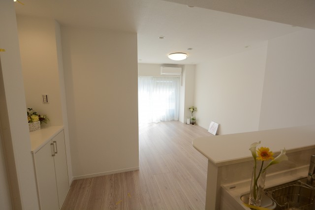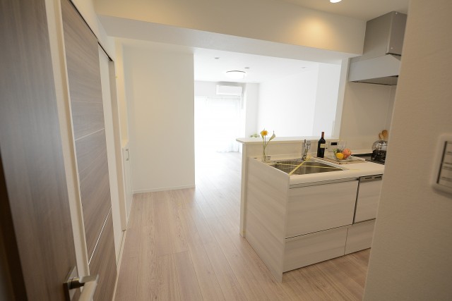 キッチンは壁付けになっています。キッチン向かって左側に玄関扉が見えますね。