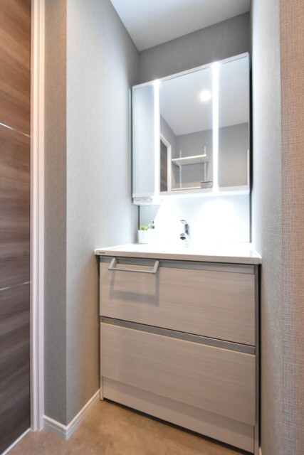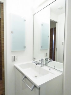 洗面化粧台の水栓はシャワーに切り替え可能な最新のものに、収納付きの三面鏡も設置されて、以前の面影は全くありません。