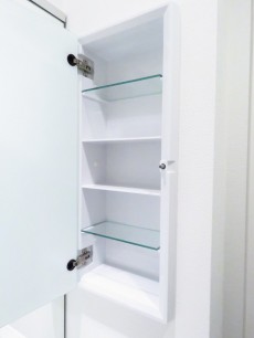 表扉の一部には縦長の鏡がついており、お出かけ前の身だしなみチェックもサッとできて便利です。