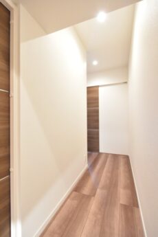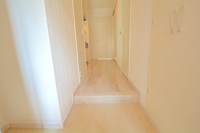 廊下は玄関から横に伸びたタイプ。宅配便やフードデリバリーの受け取り時に、お部屋の中を見られづらい構造になっています。上り口を広くとれるのもいいですね。現在シューズボックスはありませんが、入って左側に設置予定です。