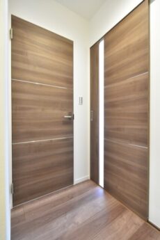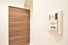 人感センサー付きの玄関ホール。人の気配で自動で照明が消灯するので消し忘れがなく経済的です。インターホンはオートロックと連動&テレビモニターがついており、うっかり知らない人を入れてしまった、なんて心配もありません。