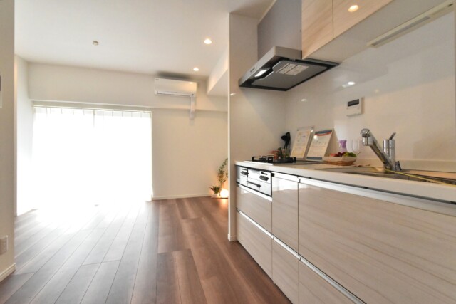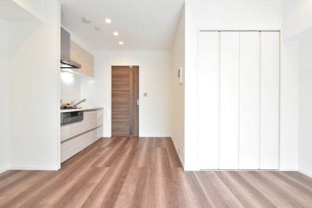 約9.7帖のリビングダイニングキッチンです。室内が明るいので、実際よりも広く見えそうです。奥行きのあるクローゼットも設置されました。リビングダイニングキッチンにある収納として、用途も広がりそうですね!