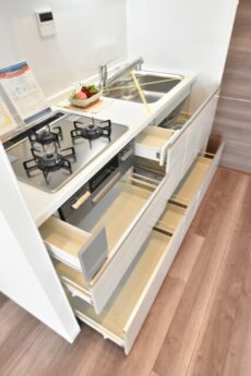 引出し収納に加えて吊戸棚もしっかりと確保されています。