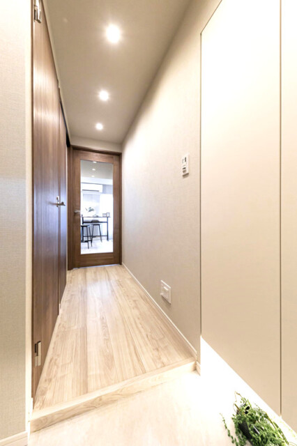 玄関から続く廊下には木目の美しいフローリング。建具のダークブラウンがアクセントになり、雰囲気を引き締めていますね。正面の扉には大きなガラスを使い、お部屋の光が入るようにしています。人感センサーが付いているので、夜でも明るい玄関が迎えてくれますよ。