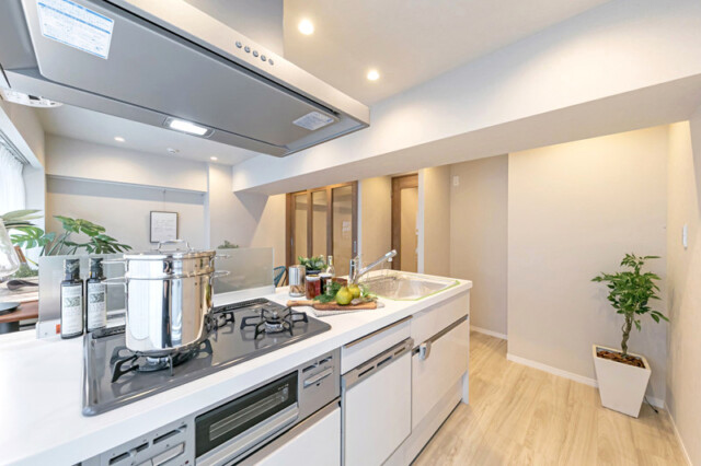 キッチン設備は3口ガスコンロ、グリルに浄水器一体型水栓と食洗機もついて充実しています。