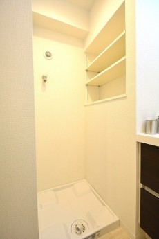 一番奥にランドリースペースがあり、使いやすい位置に棚が設置されています。