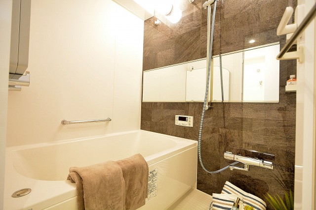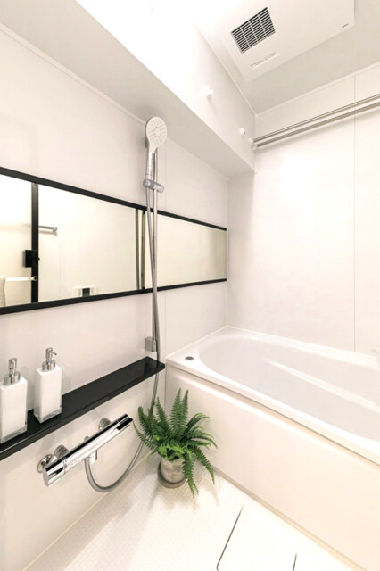 白を基調とした明るい浴室。黒のラインがシャープな印象です。TOTO製追い炊き機能付きユニットバスでいつでも快適な温度のお風呂に入れますよ。さらに浴室換気乾燥機付き。天気を気にせずお洗濯が出来るのが嬉しいですよね♪
