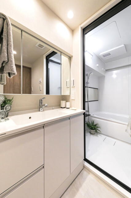 洗面室には洗面台、浴室、洗濯機スペースがひとまとめになっています。洗面台は身だしなみチェックに便利な三面鏡付。裏はミラーキャビネットになっているので洗面周りもスッキリ!