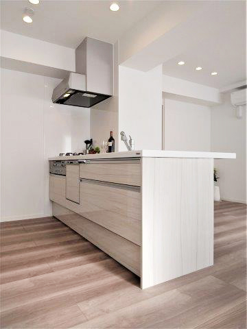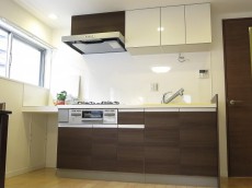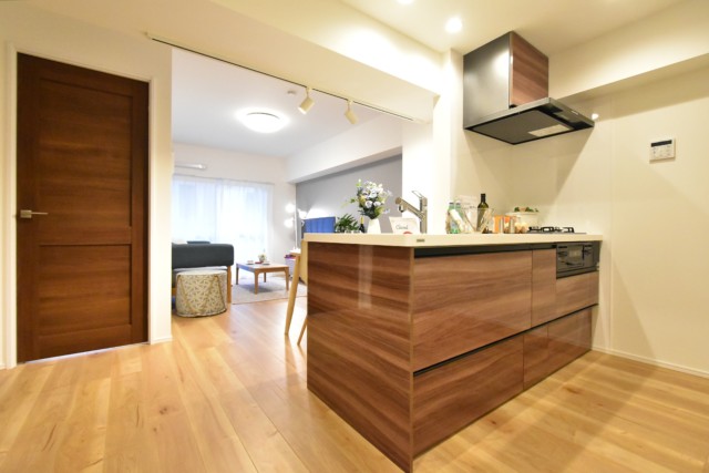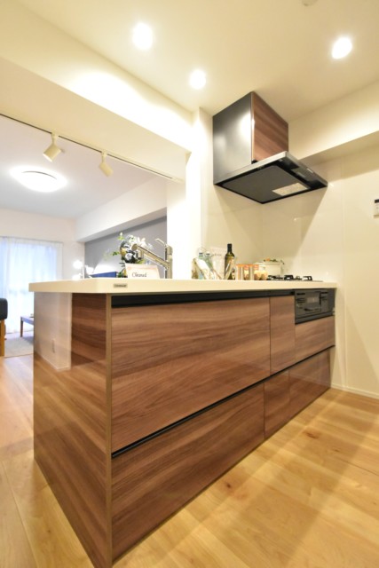 調理台は、お部屋の雰囲気に合わせたブラウンの木目パネル使用。鏡面仕上げでお掃除も楽々です♪