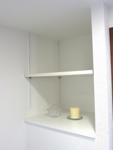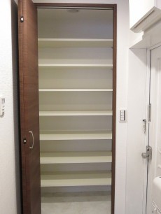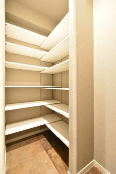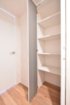 廊下の先には扉の付いた収納棚。奥行きがあって収納力がありそうです。棚が調整できるるので使いやすようにカスタマイズしちゃいましょう。