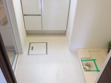 玄関扉を開けると、貼り替えたばかりのフローリングとシューズBOXが見えます。