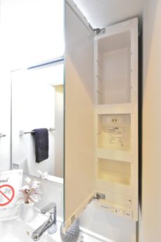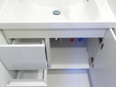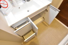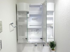三面鏡の裏は、収納出来るトレイが設置されているので、歯ブラシや洗顔フォーム、小物類はこちらに入れていつでもスッキリです。もちろん洗面ボウルの下にも、収納があるのでこちらにもどうぞ。