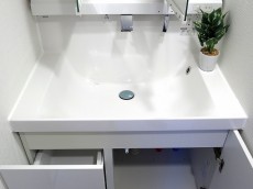 洗面化粧台は身だしなみチェックに便利な三面鏡付き。上部に照明が付いているので影になったりすることもありません。水栓が洗面台と一体になったスッキリタイプ。