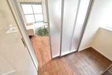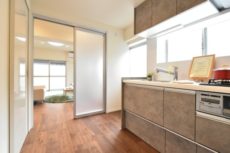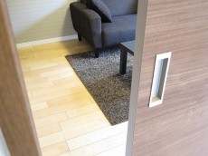キッチンとの仕切り戸は吊り下げ式でレールがありません。掃除も楽ですし、開けておいてワンルームのような使い方も出来ます。