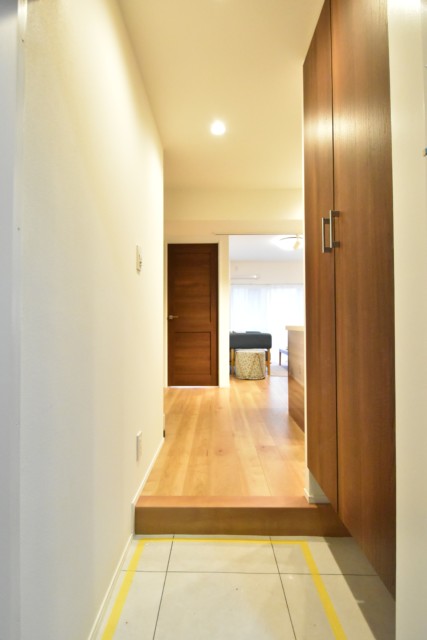 玄関からはゆったり幅の廊下が真っ直ぐ伸びています。と言っても扉は全て横向きに付いていて戸口からは室内が見えづらい造り。宅配便やフードデリバリーなどの利用機会が多い今の時代には嬉しいですよね。玄関にはトールタイプのシューズボックス、廊下には収納が並んでいます。