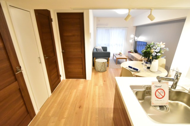 廊下を進み突き当たると、左からトイレ・リビングダイニングキッチン・洋室の入口が並んでいます。
