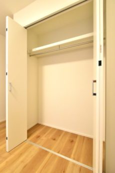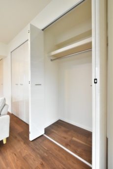 収納は間口が広くて使いやすそうなクローゼット。奥行きも深くて収納力もありますよ。キャリーバッグやスーツケースなどの大きな物を入れたり、衣装ケースなど使って更に収納力を上げるのもアリですね。