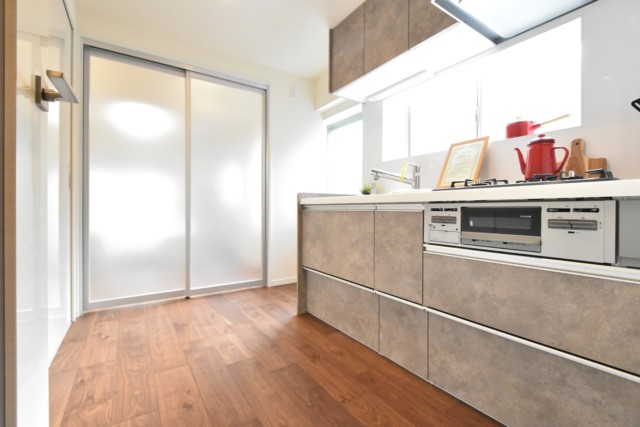 キッチンは人気のカウンタータイプ。コミュニケーションが取りやすく、調理中でも会話が弾むキッチンです。更に、こちら側からはキッチン内が見えづらいのもメリットのひとつ。ひと目を気にせず、思う存分腕を振るえますよ(^^)では、キッチンを詳しく見ていきましょう。