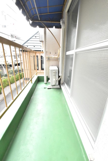 広さ2.64㎡、東向きのバルコニー。奥行きがあるからか数字より広く感じますね。上にはバルコニーが無いので、レトロな感じの屋根が付いています。