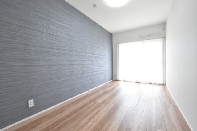 フローリングは廊下とお揃い、グレーのアクセントクロスが印象的なお部屋です。柱などの出っ張りもなく、洋室の中では一番大きいのでメインのベッドルームなどにいかがでしょう。正面の窓は南向きバルコニーに面しています。