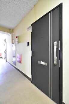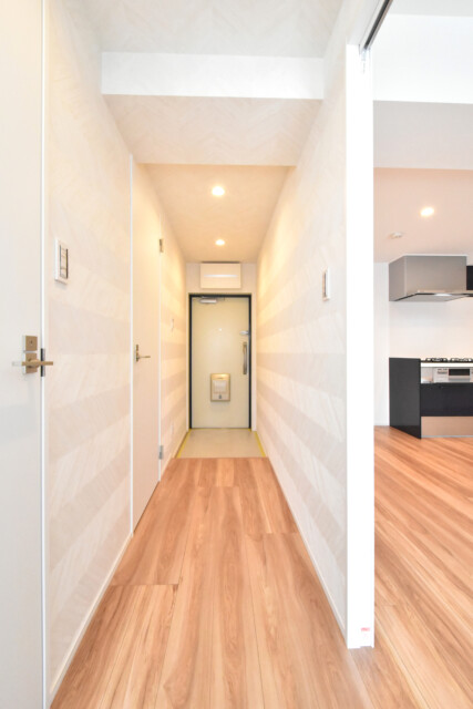 2階でエレベーターを降り、内廊下をお部屋へ向かいます。内廊下は外廊下と比べて天候に左右されず、防犯面やプライバシー面でも優れています。