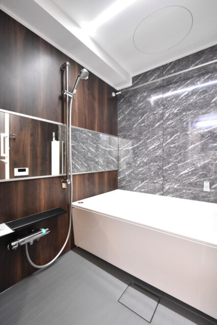 浴室は木目のアクセントパネル使用で落ち着いた雰囲気。
