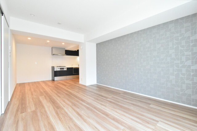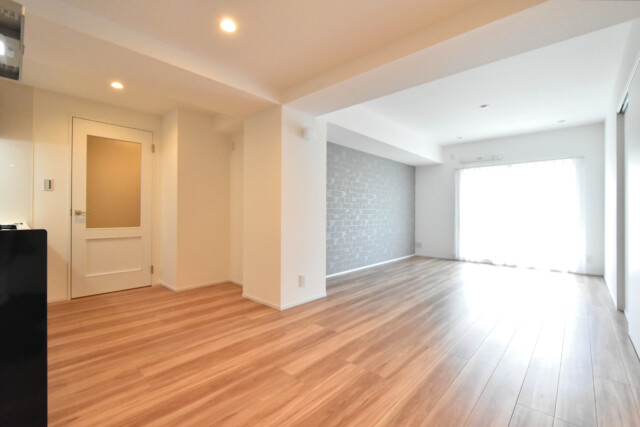 おなじみの南向き窓からの光で明るいお部屋です。全体はL字型、キッチンが腕の部分にあるのでレイアウトもしやすそうですね。奥のアクセントウォール部分を全てリビングとして使える