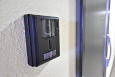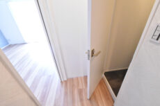 玄関ドア横にはモニター付きインターホンが設置されていて、お部屋の中から訪問者を確認する事が出来ます。ドアスコープもありますが、向こうからも覗かれている気がしてなんか苦手です。怖い映画の見過ぎかもしれませんね(笑)