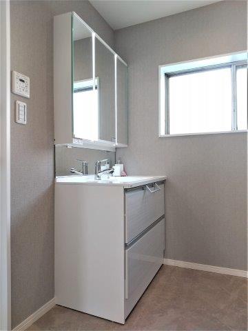 洗面室には洗面化粧台、洗濯機スペース、浴室がまとまっていて脱衣所も兼ねています。洗面化粧台は身だしなみチェックに便利な三面鏡付き。裏はキャビネットになっているので洗面周りに散らかりがちな細々したものもすっきり片付けることが出来ますよ。