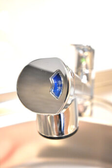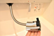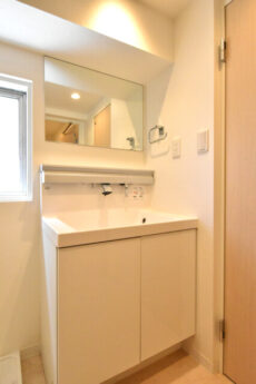 鏡はスッキリとした一枚鏡。残念ながらミラーキャビネットはありませんので、歯ブラシやコップなどの洗面周りの細かいものの置き場は考える必要がありそうです。上に付けられた水栓はヘッドが引き出せるので洗面ボウルを流したりにも便利ですよ。